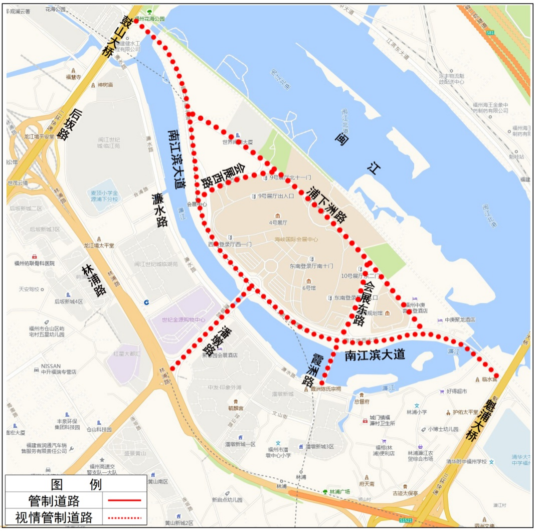 2025年10月16日12:00至18:00和2025年10月17日至10月19日每日7:30至18:00,公安交通管理部门将根据道路交通流量实际情况,视情对浦下洲路、会展东路、会展西路、南江滨大道(魁浦大桥桥下至鼓山大桥桥下)、潘墩路(林浦路路口至南江滨大道路口)、霞洲路(南江滨路口至濂水路口)实行交通管制,禁止机动车(持专用通行证车辆、公交车、出租车以及周边单位、小区车辆除外)通行。