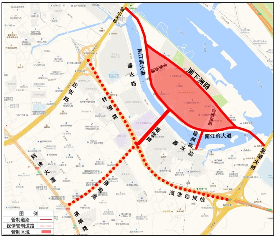 2025年10月16日7:30至12:00,对南江滨大道(魁浦大桥桥下至鼓山大桥桥下)、浦下洲路(以上均含本路)组成的围合区域内道路,潘墩路(林浦路路口至南江滨大道路口)、霞洲路(南江滨路口至濂水路口)实行交通管制,禁止机动车(持专用通行证车辆以及周边单位、小区车辆除外)通行,禁止非机动车、行人(持专用证件人员除外)通行,地铁4号线会展中心站仅允许持专用证件人员出站。