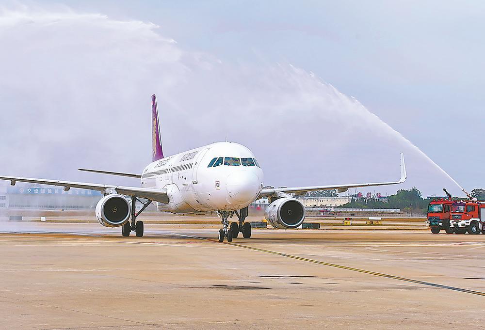 10月26日,从金边飞来的柬埔寨国家航空的客机抵达福州长乐国际机场时举行过“水门”仪式。林善传 摄