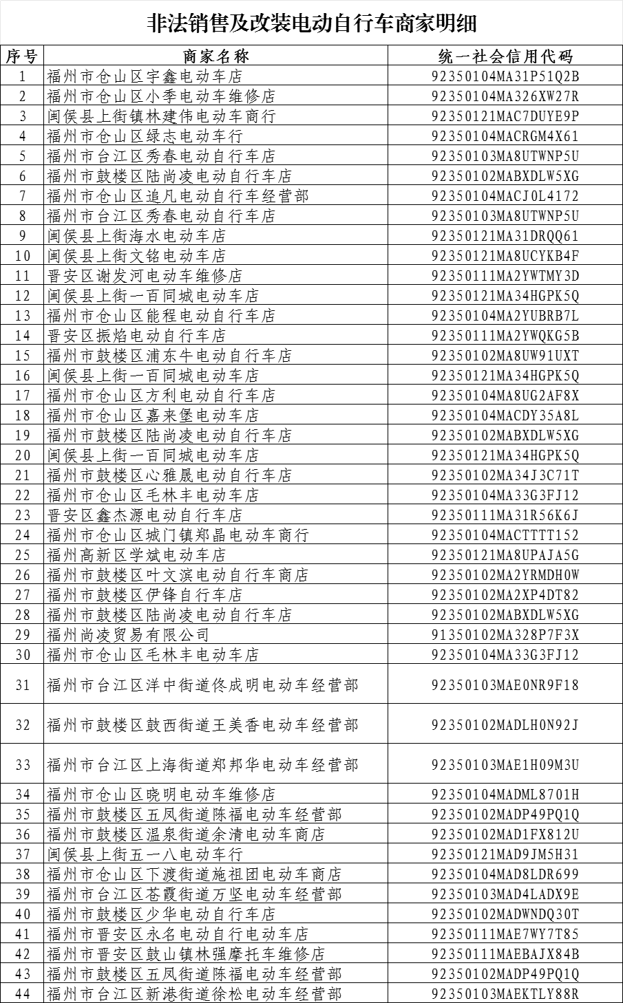 根据有关文件精神,电动自行车销售企业应当销售符合国家标准的电动自行车。经研究,福州市商务局决定暂停福州市鼓楼区浦东牛电动自行车店、福州市鼓楼区心雅晟电动自行车店、福州市鼓楼区陆尚凌电动自行车店、福州市仓山区宇鑫电动车店、福州市台江区秀春电动自行车店、闽侯县上街文铭电动车店等44个非法销售及改装电动自行车商家的电动自行车以旧换新补贴活动资格。