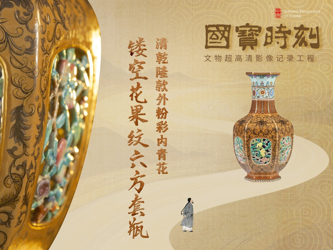 国宝时刻·清乾隆款外粉彩内青花镂空花果纹六方套瓶
