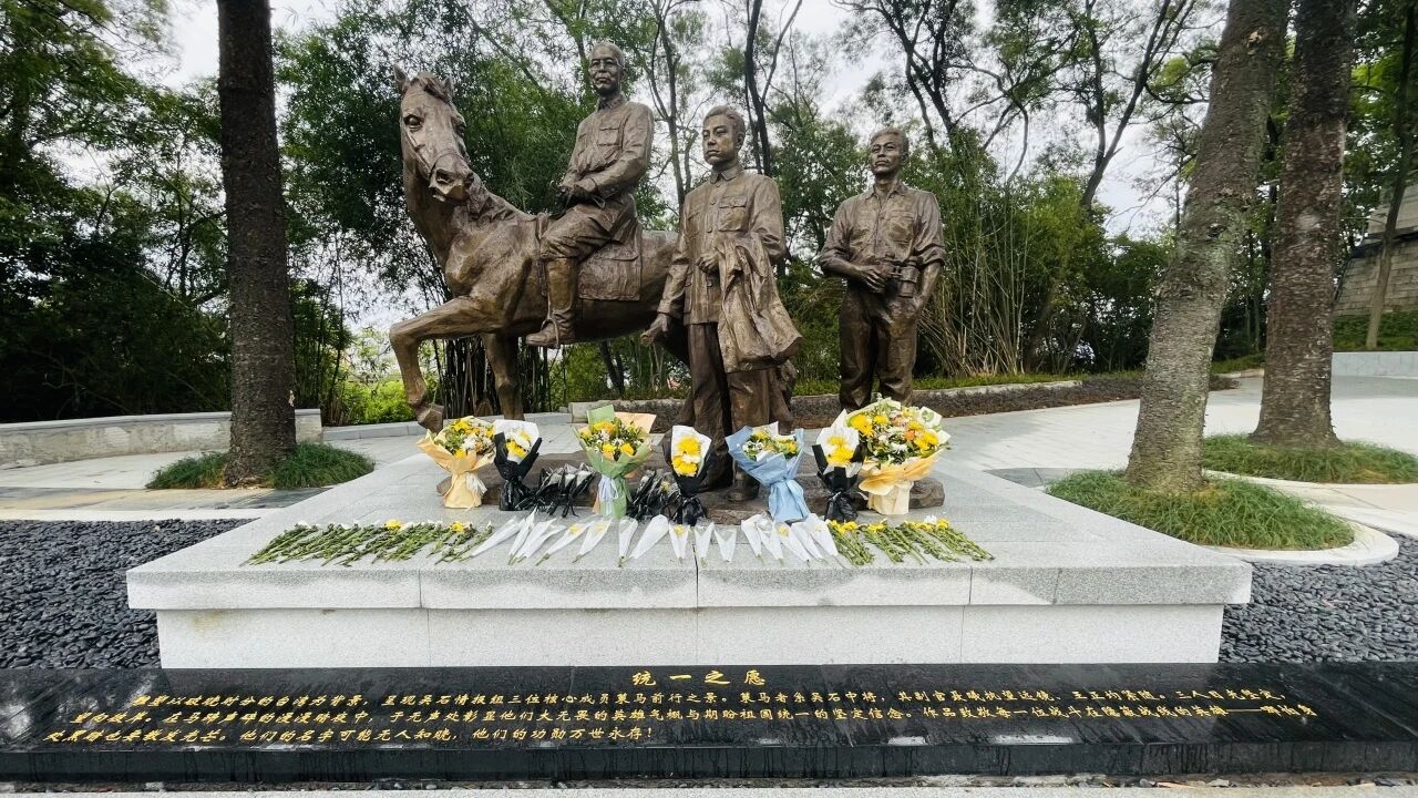 在纪念园中轴线上,全国首座以吴石及其副官聂曦、王正均为主题的艺术纪念群雕前,一束束鲜花静默无声,诉说着后人不尽的追思。该雕塑名为《统一之愿》,以破晓时分的台湾为背景,呈现吴石情报组三位核心成员策马前行之景。策马者系吴石中将、其副官聂曦手执望远镜、王正均紧随身旁,三人目光坚定,望向彼岸。作品致敬每一位战斗在隐蔽战线的英雄——哪怕身处黑暗也要散发光芒。这座雕塑于今年9月落成,恰逢三位情报工作烈士牺牲75周年,更显意义特殊。