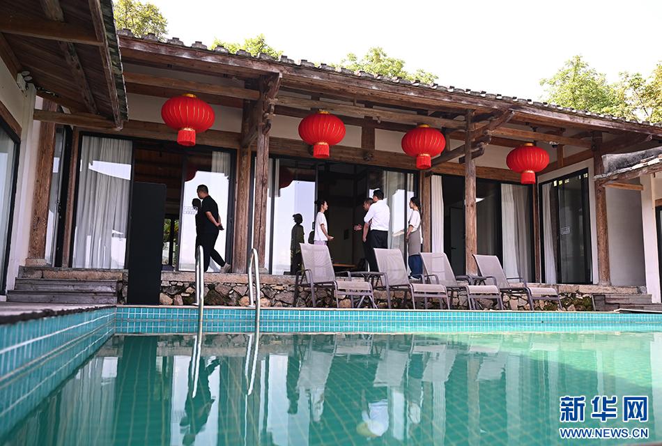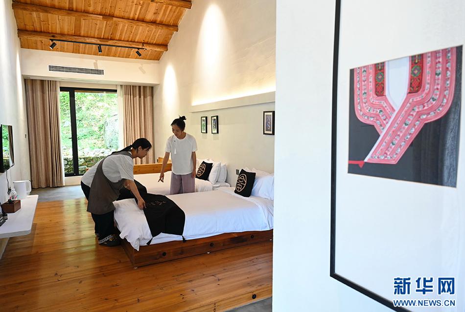 5月2日,松山镇八井村畲乡里民宿度假区主人林情(右)在指导员工整理客房。新华社记者 林善传 摄
