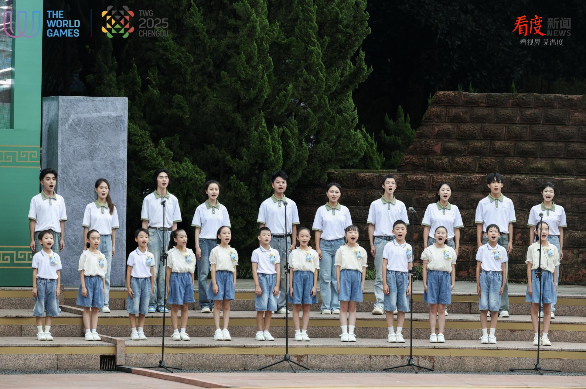 “是梦召唤了心海,Lift the sails and lift my life。是梦带我穿越未来,是梦让世界都跟着澎湃……”现场,由成都市泡桐树小学24位小学生代表与四川电影电视学院20位大学生代表组成的合唱团,倾情唱响本届世运会主题曲《逐梦》。