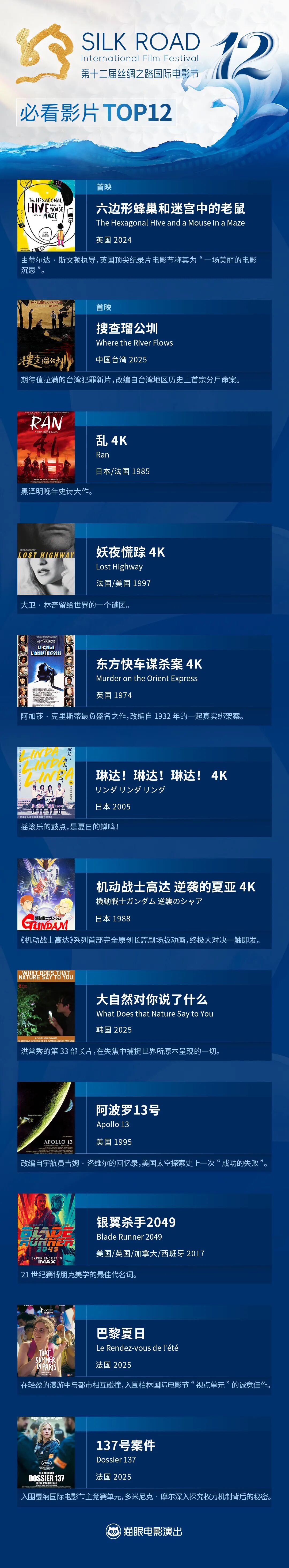 第十二届丝绸之路国际电影节展映单元 丨12部必看影片,赴一场视听之约 2025-09-20 15:58 福视悦动 第十二届丝绸之路国际电影节展映单元已于9月18日正式开票!我们特别从本届展映片单中遴选12部必看佳作,邀你一同跃入这场视听狂欢,共赴银幕盛宴! 来源:第十二届丝绸之路国际电影节 编辑:黄国伟