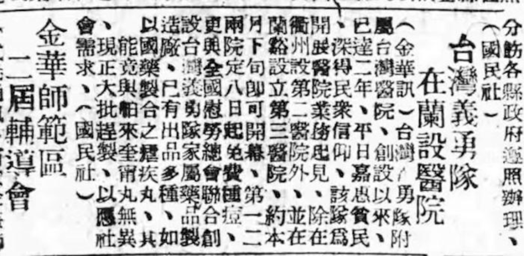 报道称:“台湾义勇队附属台湾医院创设以来已达二年,平日嘉惠贫民,深得民众信仰。该队为开展医院业务起见,除在衢州设第二医院外,并在兰溪设立第三医院,约本月下旬即可开幕。”报道中还提到:“第一、二医院定8日起免费种痘,更与全国慰劳总会联合创设台湾义勇队家属药品制造厂,已有出品多种,如以国药制合之疟疾丸,其能竟与舶来奎宁丸无异,现正大批赶制,以应社会需求。”