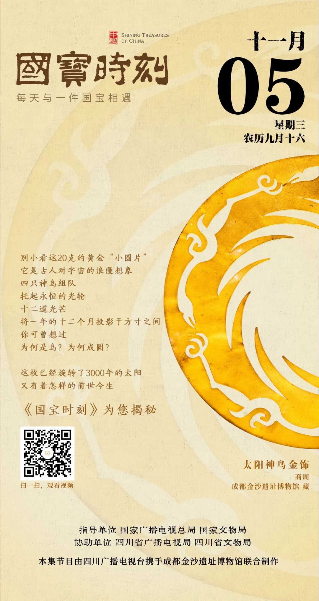 别小看这20克的黄金“小圆片”,它是古人对宇宙的浪漫想象;四只神鸟组队,托起永恒的光轮;十二道光芒,将一年的十二个月投影于方寸之间;你可曾想过?为何是鸟?为何成圆?这枚已经旋转了3000年的太阳,又有着怎样的前世今生?《国宝时刻》为您揭秘!