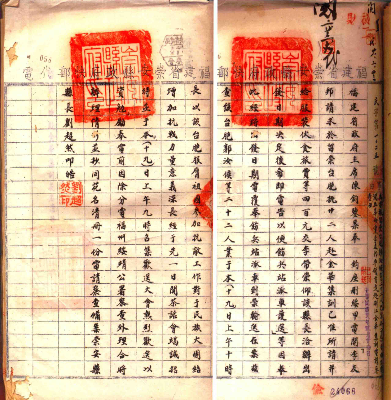 崇安县县长刘浩然欢送留崇台胞二十二人赴金华参加台湾义勇队电文