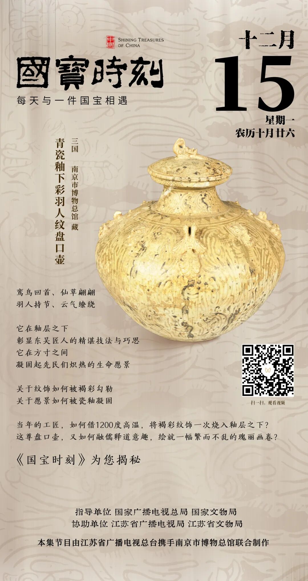 鸾鸟回首、仙草翩翩、羽人持节、云气缭绕。它在釉层之下,彰显东吴匠人的精湛技法与巧思。它在方寸之间,凝固起先民们炽热的生命愿景。关于纹饰如何被褐彩勾勒,关于愿景如何被瓷釉凝固。当年的工匠,如何借1200度高温,将褐彩纹饰一次烧入釉层之下?这尊盘口壶,又如何融儒释道意趣,绘就一幅繁而不乱的瑰丽画卷?《国宝时刻》为您揭秘!