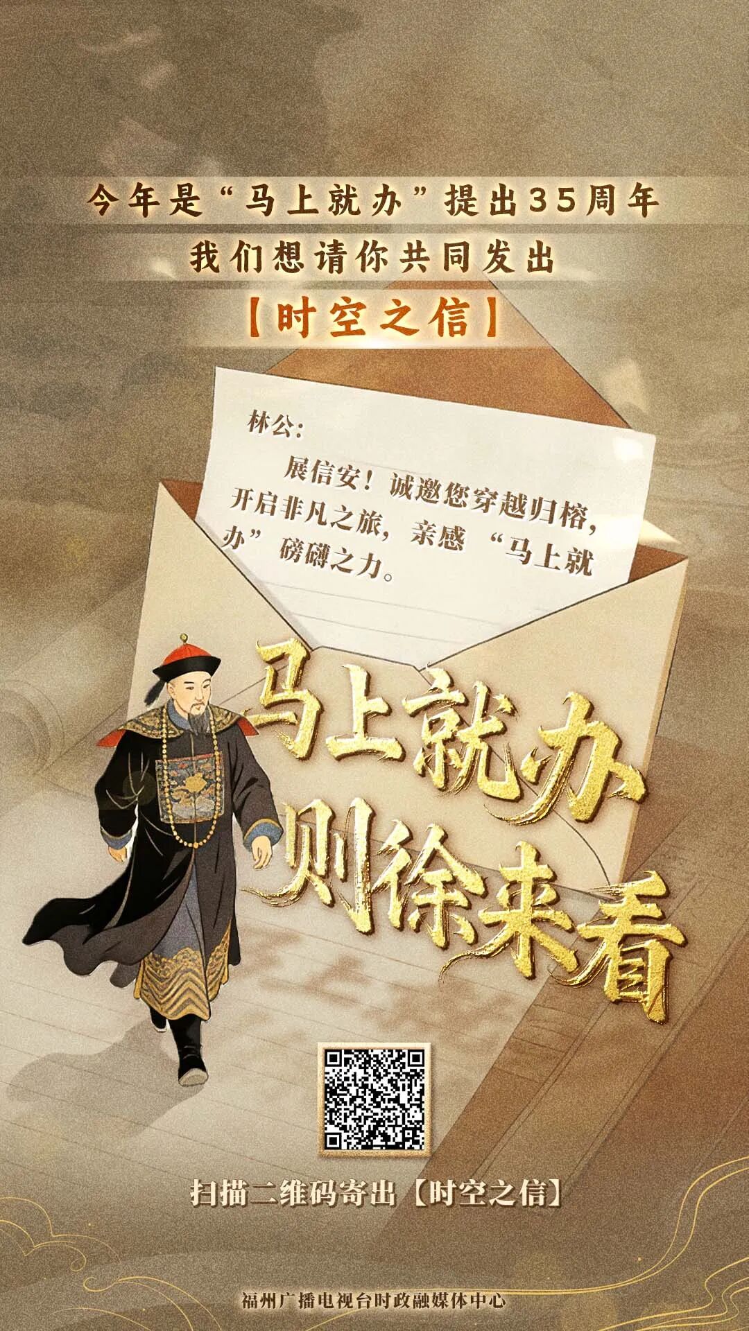 在“马上就办”提出35周年之际,我们想请你共同发出一封【时空之信】,邀请先贤林则徐穿越时空,回到他的家乡福州,开启一场非凡的体验之旅,感受“马上就办”的思想伟力和实践伟力。
