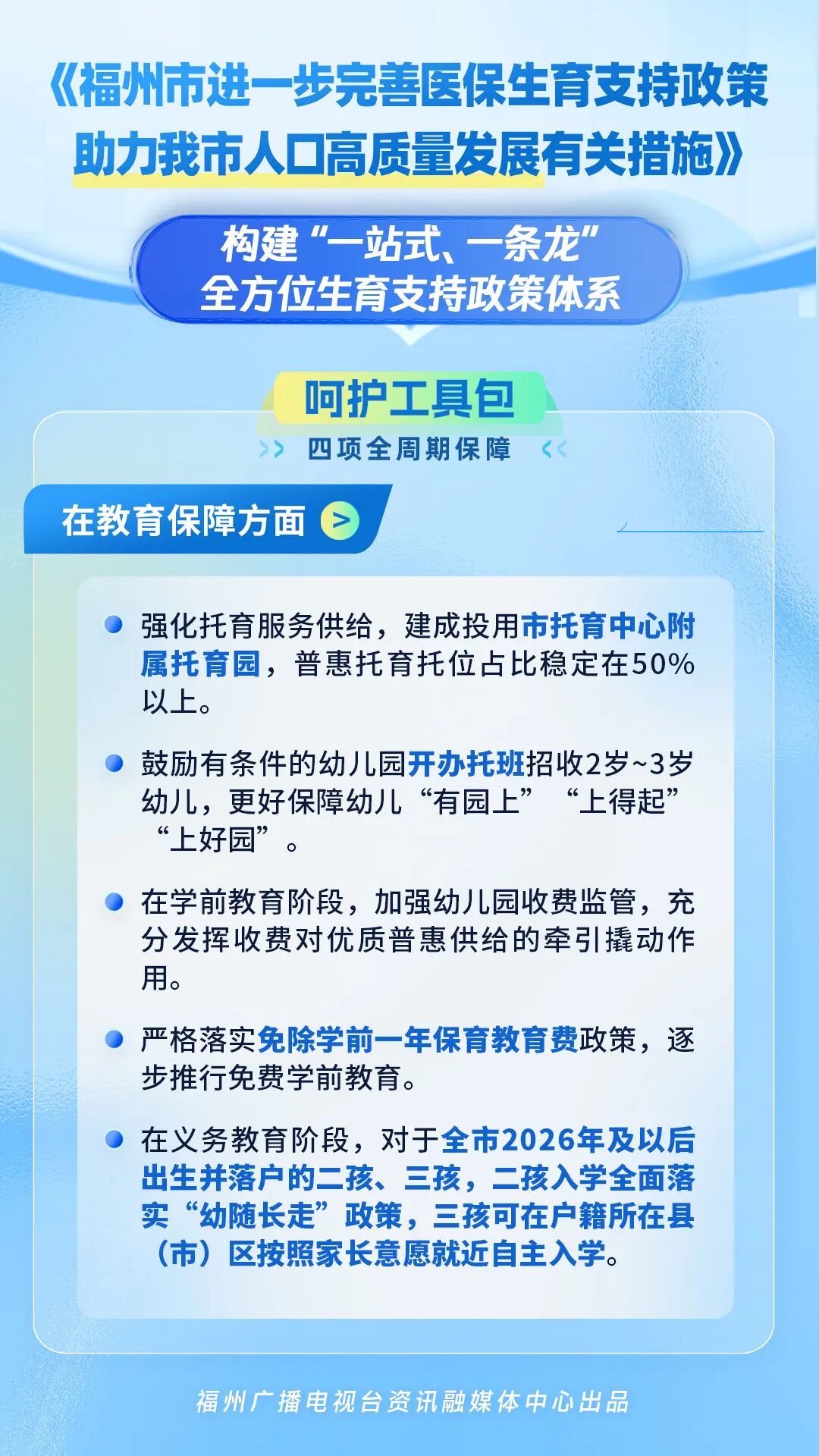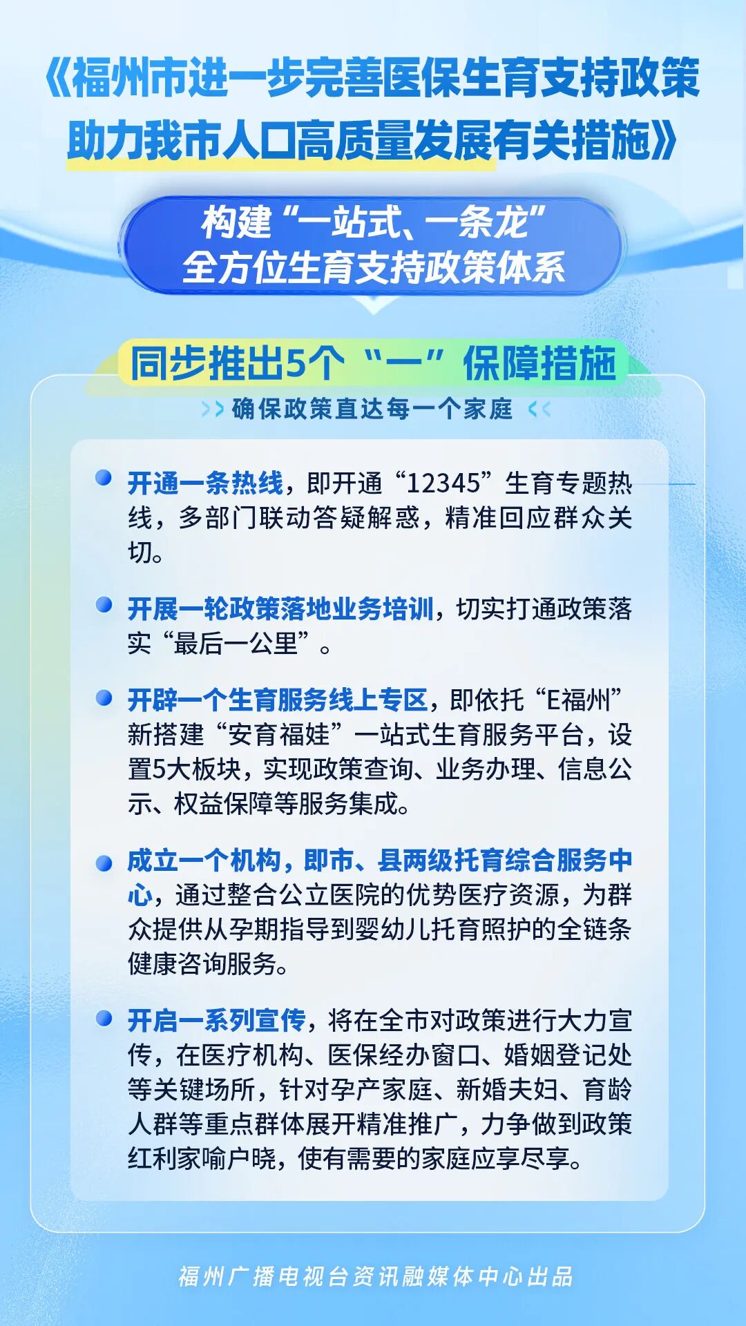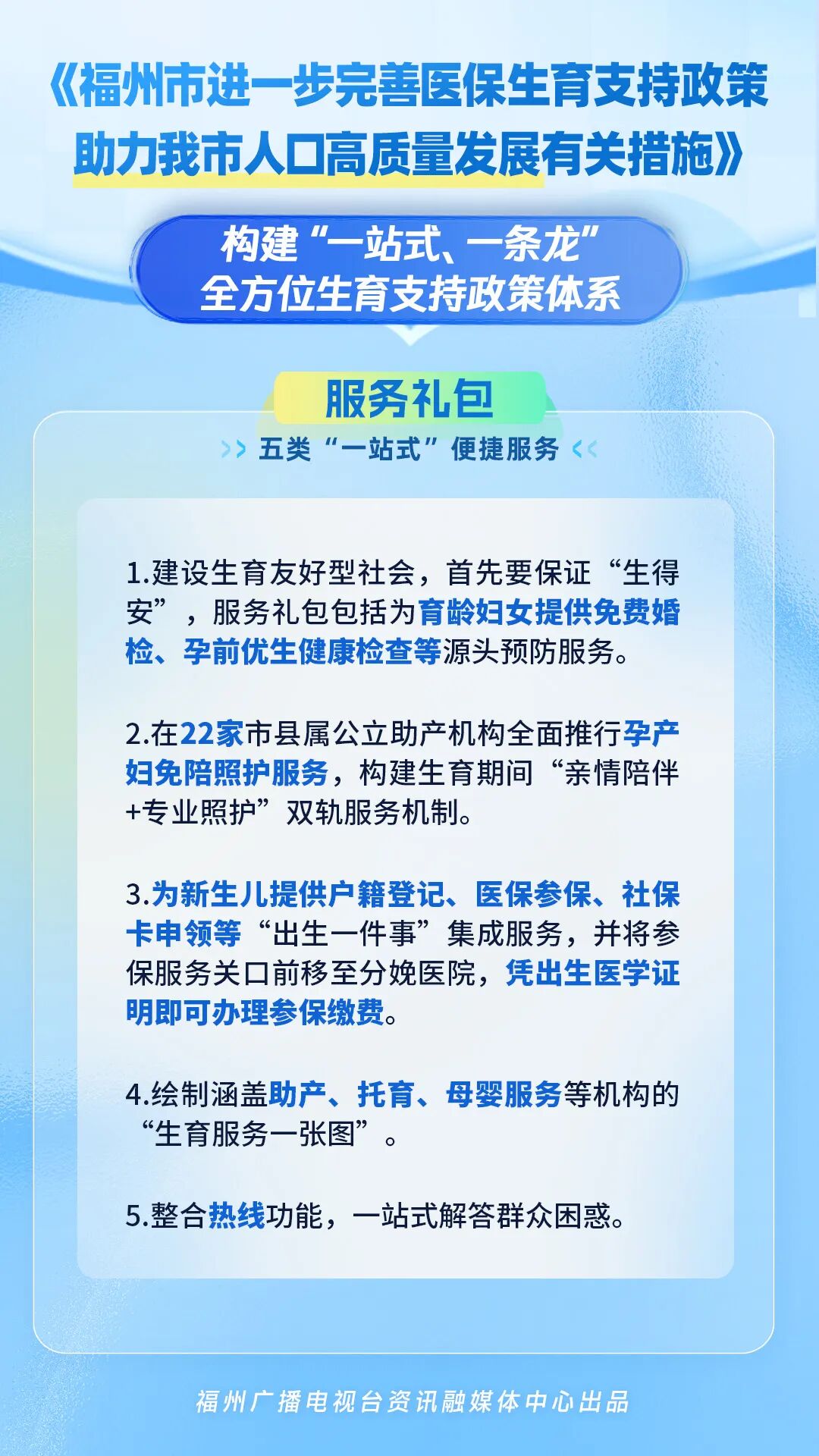 近期,福州市委市政府研究出台《福州市进一步完善医保生育支持政策助力我市人口高质量发展有关措施》,并配套推出一系列深化举措,旨在构建“一站式、一条龙”的全方位生育支持政策体系,该政策拟于2026年1月1日起正式实行。