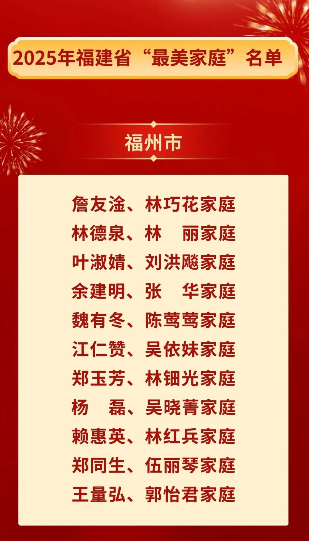 他们是:詹友淦、林巧花家庭,林德泉、林丽家庭,叶淑婧、刘洪飚家庭,余建明、张华家庭,魏有冬、陈莺莺家庭,江仁赞、吴依妹家庭,郑玉芳、林钿光家庭,杨磊、吴晓菁家庭,赖惠英、林红兵家庭,郑同生、伍丽琴家庭,王量弘、郭怡君家庭。