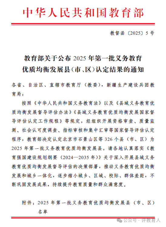 2025年第一批义务教育优质均衡发展县(市、区)名单