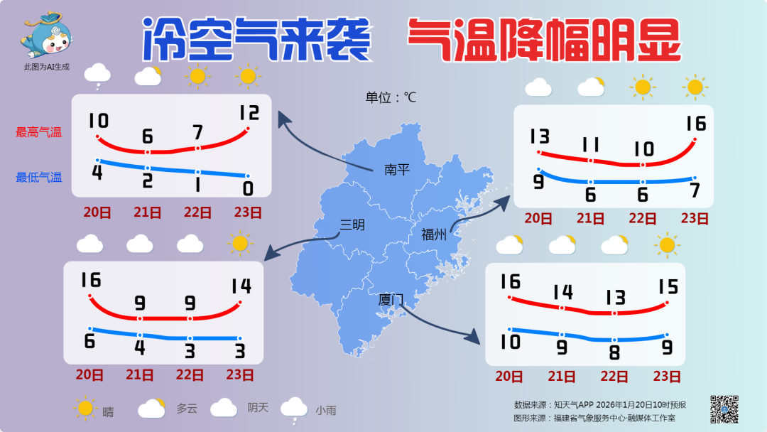 气温方面,受强冷空气影响,全省气温明显下降,最低气温过程降温幅度5℃~11℃,21日~24日夜晨气温低,最低气温出现在24日早晨,最低气温西部、北部部分城区达-4℃~2℃,有霜冻或结冰,中南部沿海县市城区6℃~10℃,其余地区城区2℃~6℃,部分有霜或霜冻。