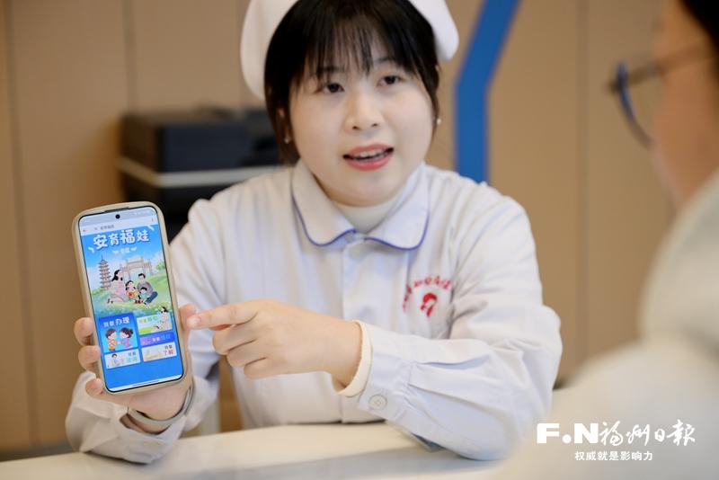 市第二总医院妇幼保健院产科护士指导家属使用“e福州App”上的“安育福娃”专区。