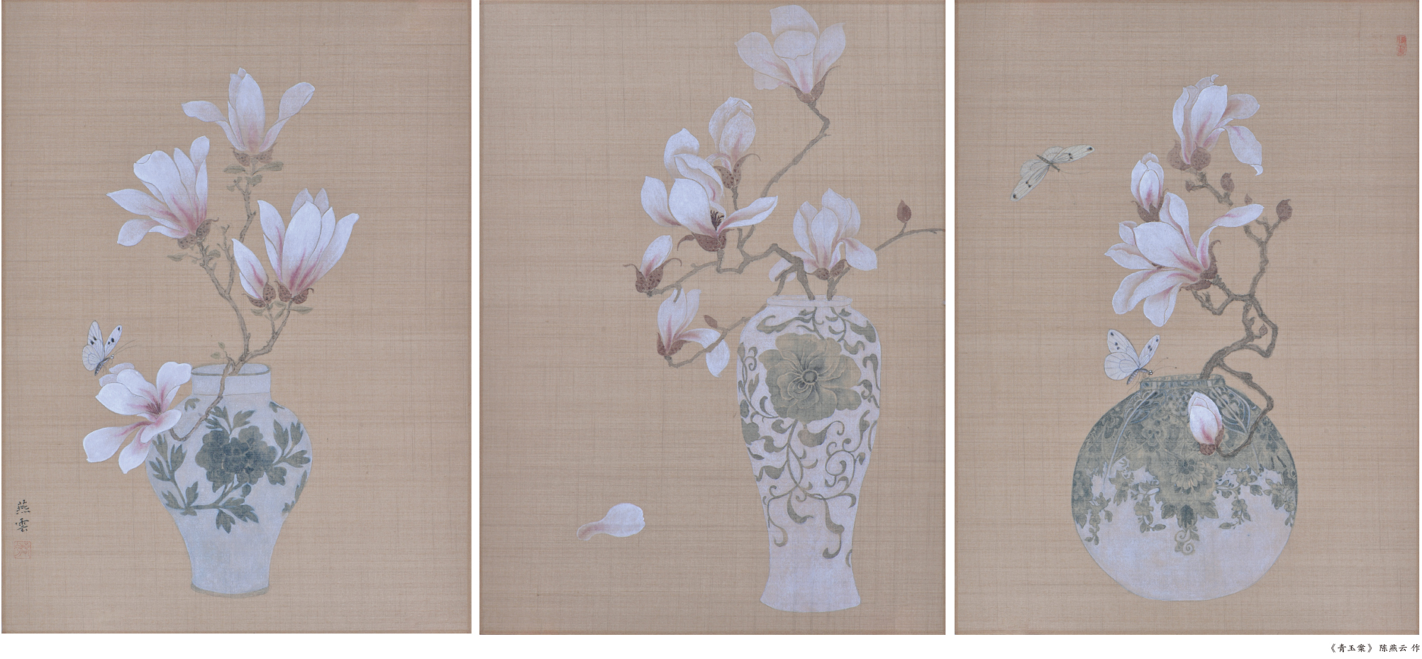 其作品的视觉语言,首先体现在设色的克制与雅致。不同于传统工笔重彩的富丽堂皇,陈燕云偏爱低饱和度的色调:浅粉的玉兰晕染着朦胧的白,淡紫的牡丹糅合着水墨的灰,绣球花以青灰与浅褐交织,宛若被时光滤过的光影。这种“淡彩”处理,并非色彩的缺失,而是将色彩化作情绪的载体——玉兰的素白衬出瓷瓶的古朴,鸢尾的淡紫与牡丹的柔粉相映成趣,冷暖色调的微妙平衡,让画面始终保持着温润的呼吸感,恰如江南烟雨般含蓄内敛。