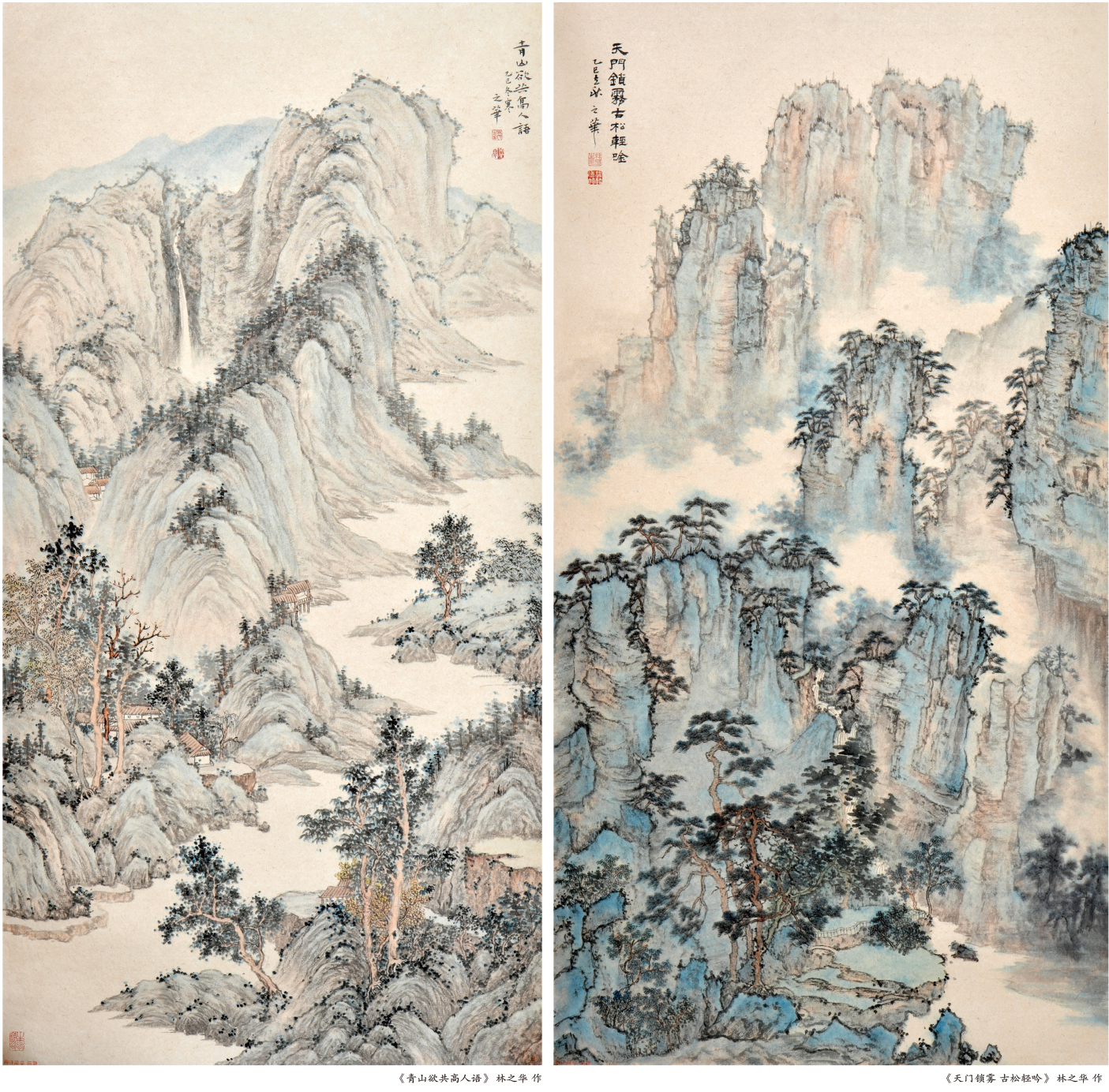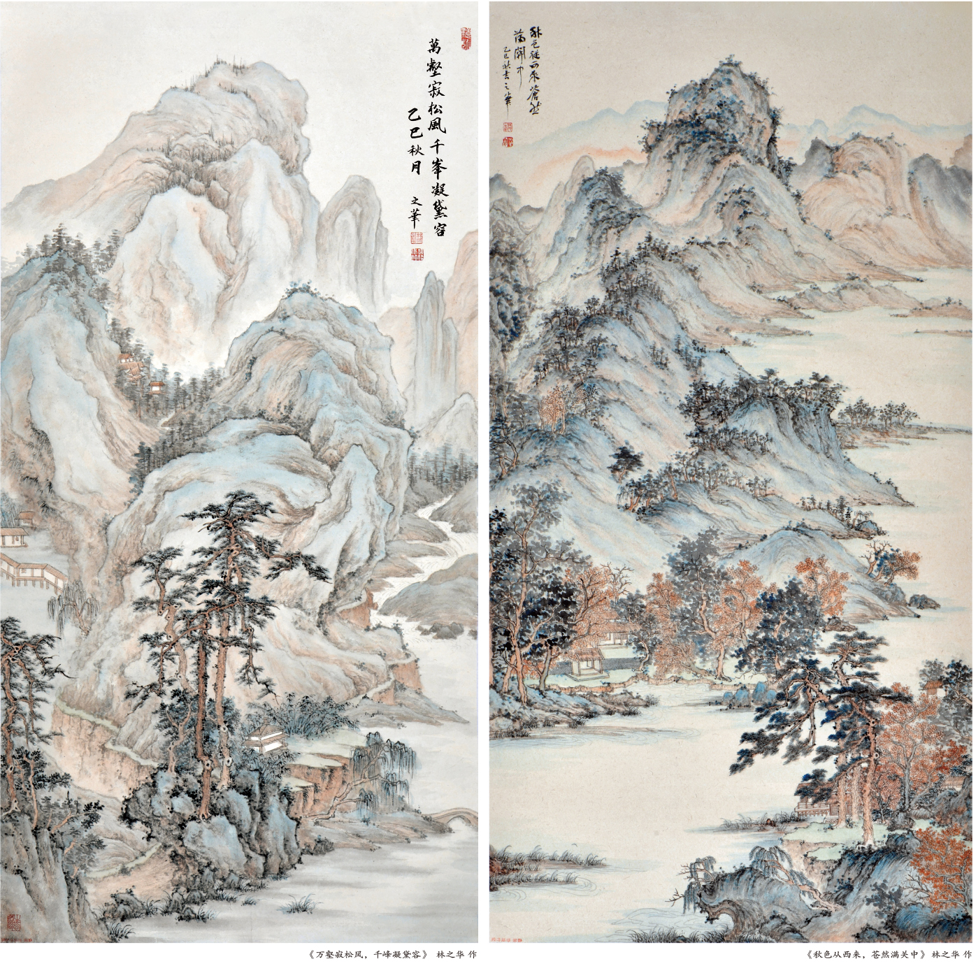 林之华的创作融汇南北诸家,山石兼具披麻、解索等传统韵味与北派雄浑气象;林木取吴门灵动笔致,设色以浅绛为基,偶施青绿,于素雅中见鲜活。画面中峰峦云烟流动,亭台茅舍错落,既延续“可居可游”的人文理想,更透出女性视角独有的细腻观照。