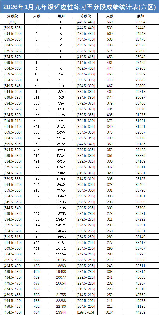 今天下午,福州市教育局发布2026年1月九年级适应性练习五分段成绩统计表(六区)。