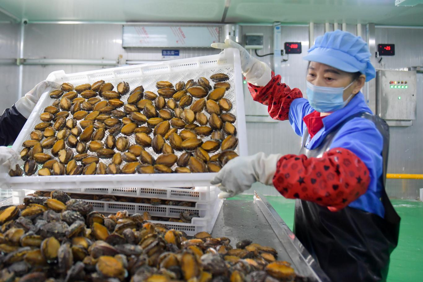 在中国罗源鲍鱼供应链中心,工人对鲍鱼进行冷链加工。