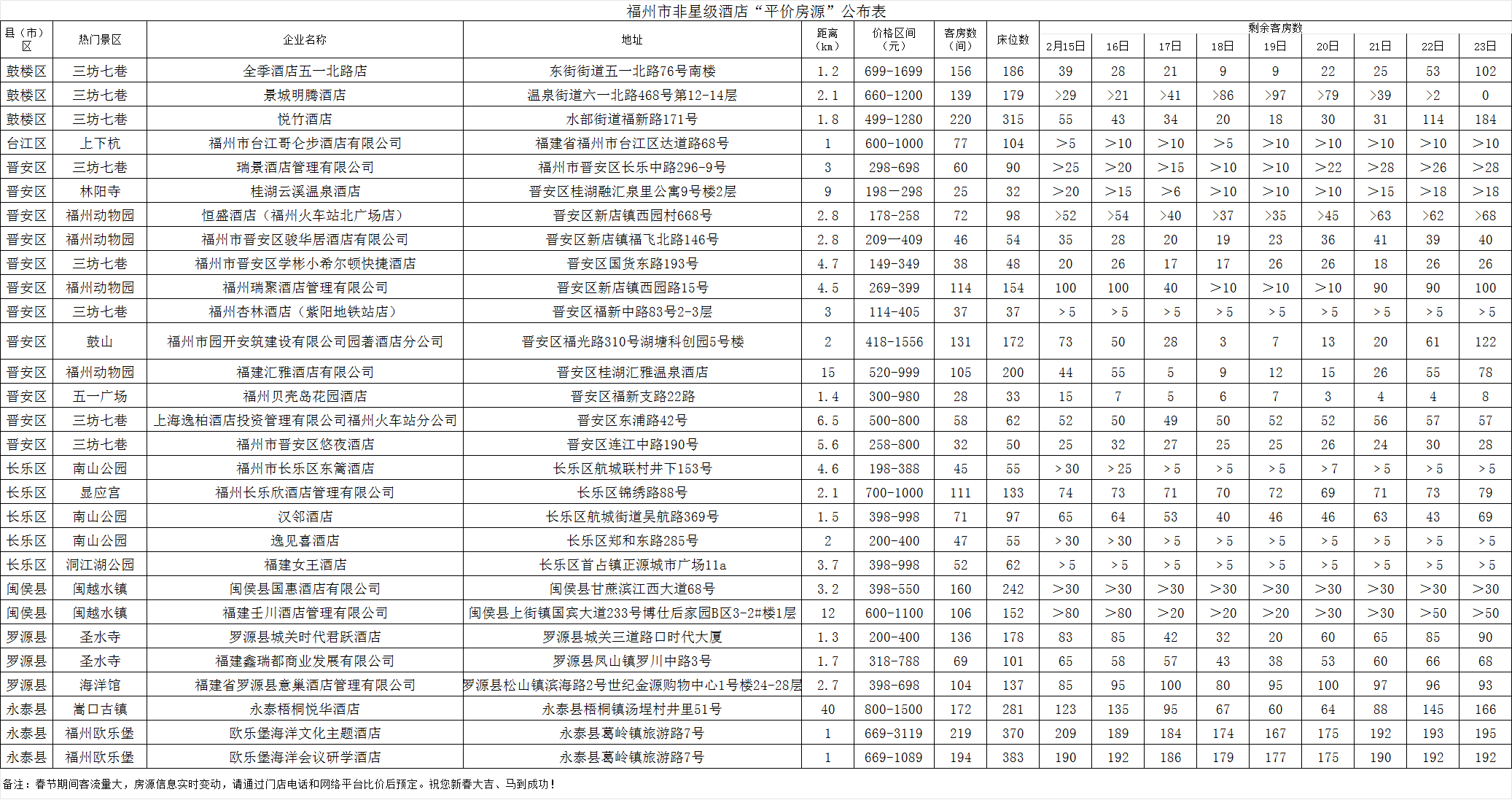 此外,全市526家非星级住宿企业还发出承诺,将在春节期间保持合理定价、提供优质服务。根据承诺,相关酒店春节期间将以节前三个月均价为基数,800元以下的房型涨幅控制在1.5倍以下(即基准价2.5倍;如基准价500元,节日限价1250元);800元(含)—1500元的房型涨幅控制在1.3倍以下;1500元以上(含)的房型涨幅控制在1倍以下。相关酒店名单可通过“福州商务”公众号查询。