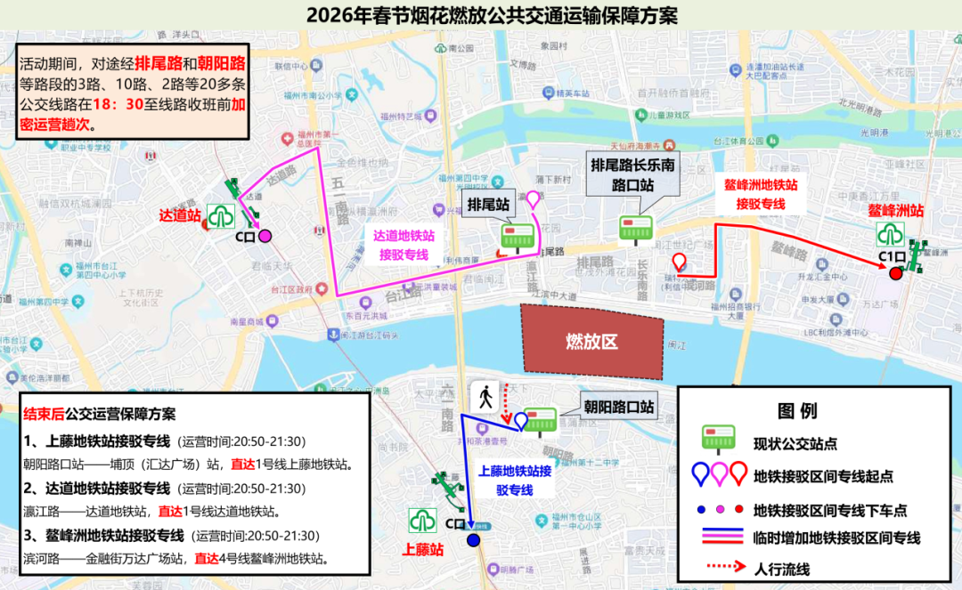 1.开通上藤地铁站接驳专线。由朝阳路口站发车直达上藤地铁站,车辆由朝阳路口站(北侧)发车,行驶朝阳路、六一南路至埔顶(汇达广场)站(西侧),车辆起点停靠:朝阳路口站(北侧),终点停靠:埔顶(汇达广场)站(西侧)。运营时间:2月17日20:50至21:30。