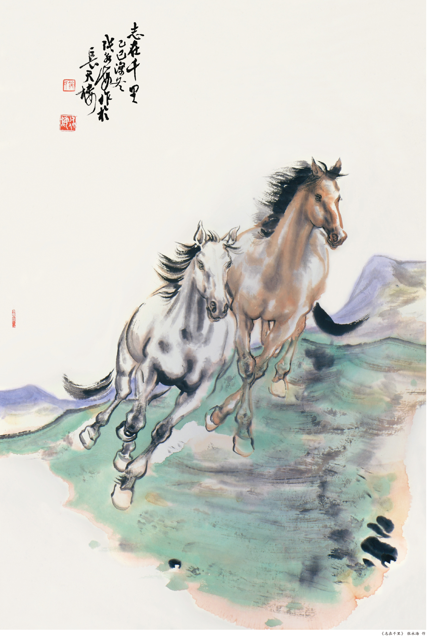 张永海笔下的骏马,姿态万千,气骨各具。《志在千里》中,两匹骏马一前一后,鬃毛飞扬,四蹄腾空,似将原野长风尽收笔底;《万里雄风》里二马并驱,笔力沉厚,墨色润中带枯,步伐节奏皆凝于笔痕墨韵之间;《马到成功》中黄驹英姿飒爽,前蹄轻扬,后蹄蓄力,身姿跃动于山林石壑间,仿佛下一刻便要破纸而出,踏出锦绣前程。