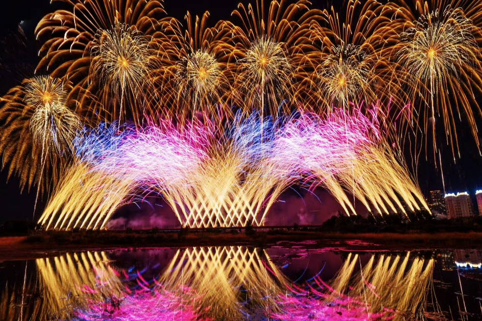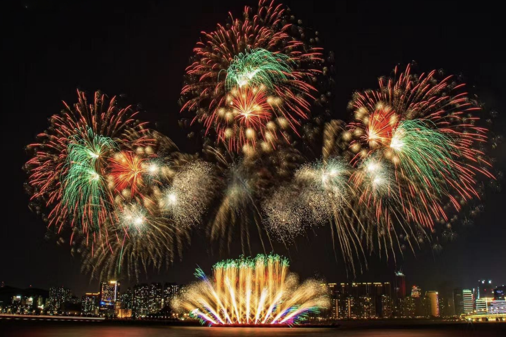 赤橙黄绿的焰火交织形成漫天梦幻云霞,时而如繁花绽放,时而如星河倾泻,在夜空中共绘绚丽斑斓的画卷,映照出福州人民多彩生活的蓬勃图景。