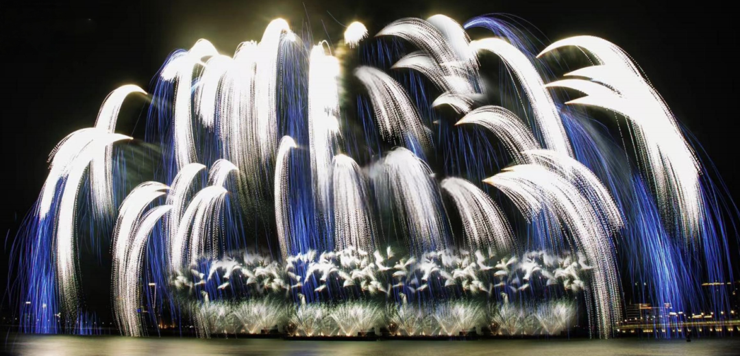 白光如银河闪烁明灭,蓝焰如闽江水浪托举,万点火光从高空垂直倾泻,实现“星河落人间”的奇幻效果。闽江星潮润榕城,白瀑光辉耀双塔。