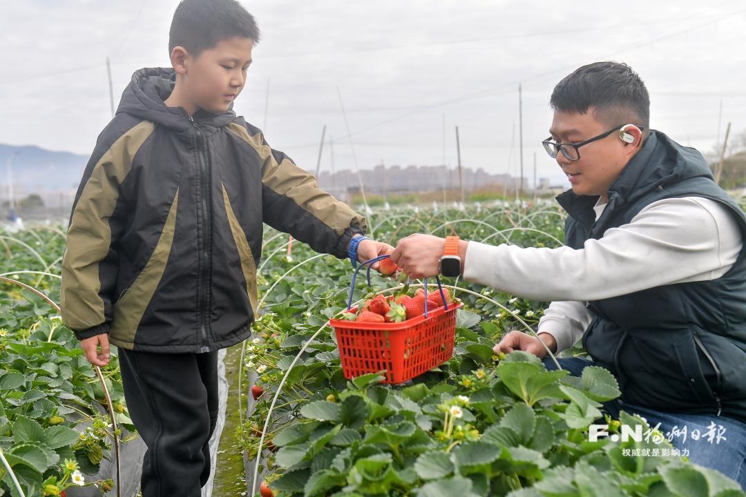 “老板,再给我装些红宝草莓,带回家给孩子尝尝!”“妙香草莓,咬一口全是汁水,我们每年春节都特地来摘。”连日来,不少市民游客携家带口来到罗源县松山镇八井村的甜心草莓园,手提采摘篮,弯腰挑选、轻掐果蒂,沉浸在田园采摘的乐趣中。