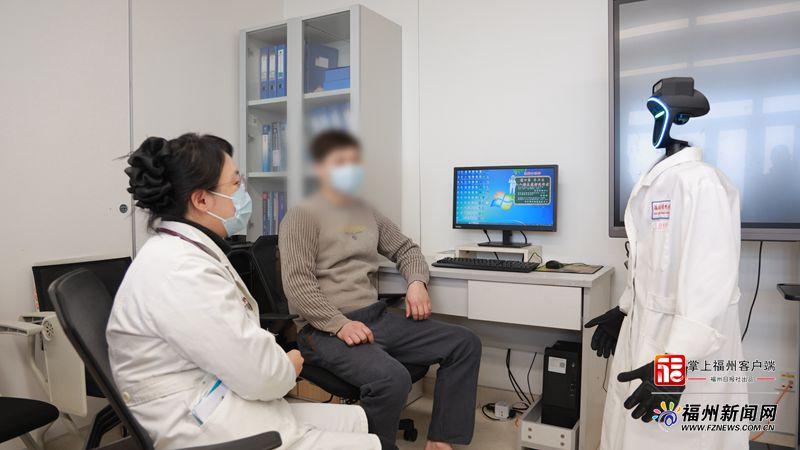 在医院诊室里,李先生(化名)的血糖数据、饮食记录、运动情况通过身旁人形机器人的大语言模型算法进行推理。(福州大学附属省立医院供图)