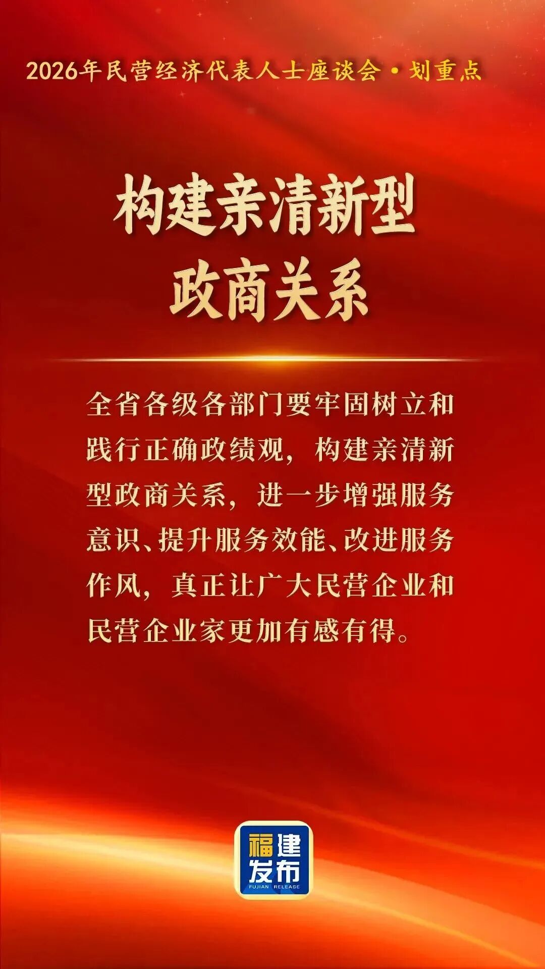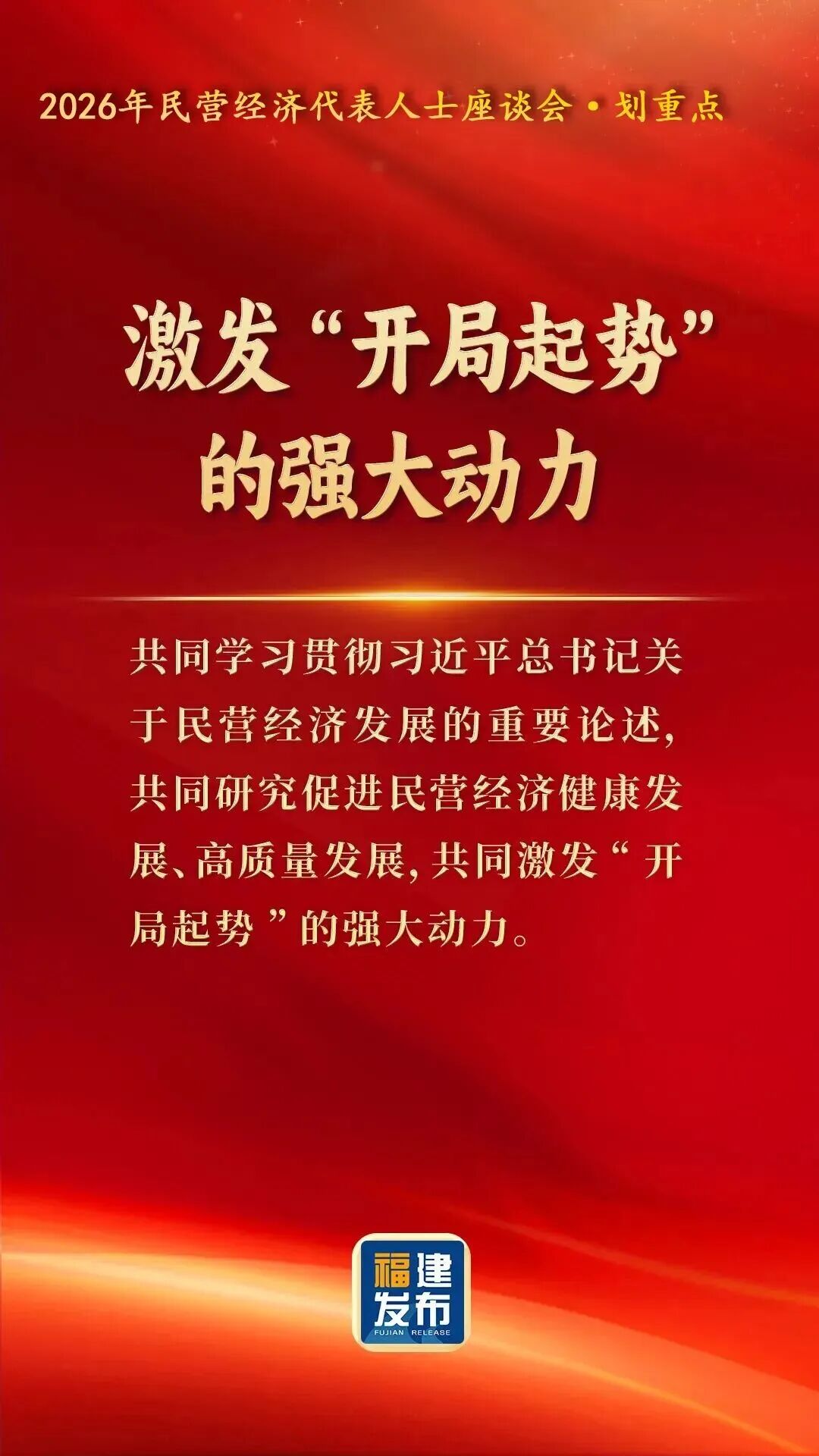 丙午马年开假第一天,2月24日,省委、省政府连续第六年以“新春第一会”形式,在福州召开民营经济代表人士座谈会。会上,省领导与民营企业家共同学习贯彻习近平总书记关于民营经济发展的重要论述,研究促进民营经济健康发展、高质量发展,激发“开局起势”的强大动力,以旗帜鲜明的态度、真真切切的尊重和实实在在的举措,鼓励和支持全省广大民营企业和民营企业家坚定信心、振奋精神、奋勇争先,为实现“十五五”良好开局、奋力谱写新征程新福建建设新篇章作出新的贡献。省委书记、省人大常委会主任周祖翼出席并讲话,省委副书记、省长赵龙主持。省政协主席滕佳材,省委副书记、福州市委书记郭宁宁出席。
