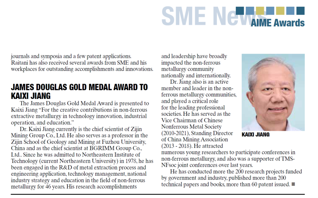 记者从福州大学获悉,日前,美国矿业、冶金与石油工程师学会(AIME)公布讯息,2026年度詹姆斯·道格拉斯金奖(James Douglas Gold Medal Award)授予福州大学紫金地质与矿业学院蒋开喜教授。这一奖项自1922年设立,被誉为全球有色金属冶金领域的“诺贝尔奖”,蒋开喜教授成为首位获该奖项的中国学者。
