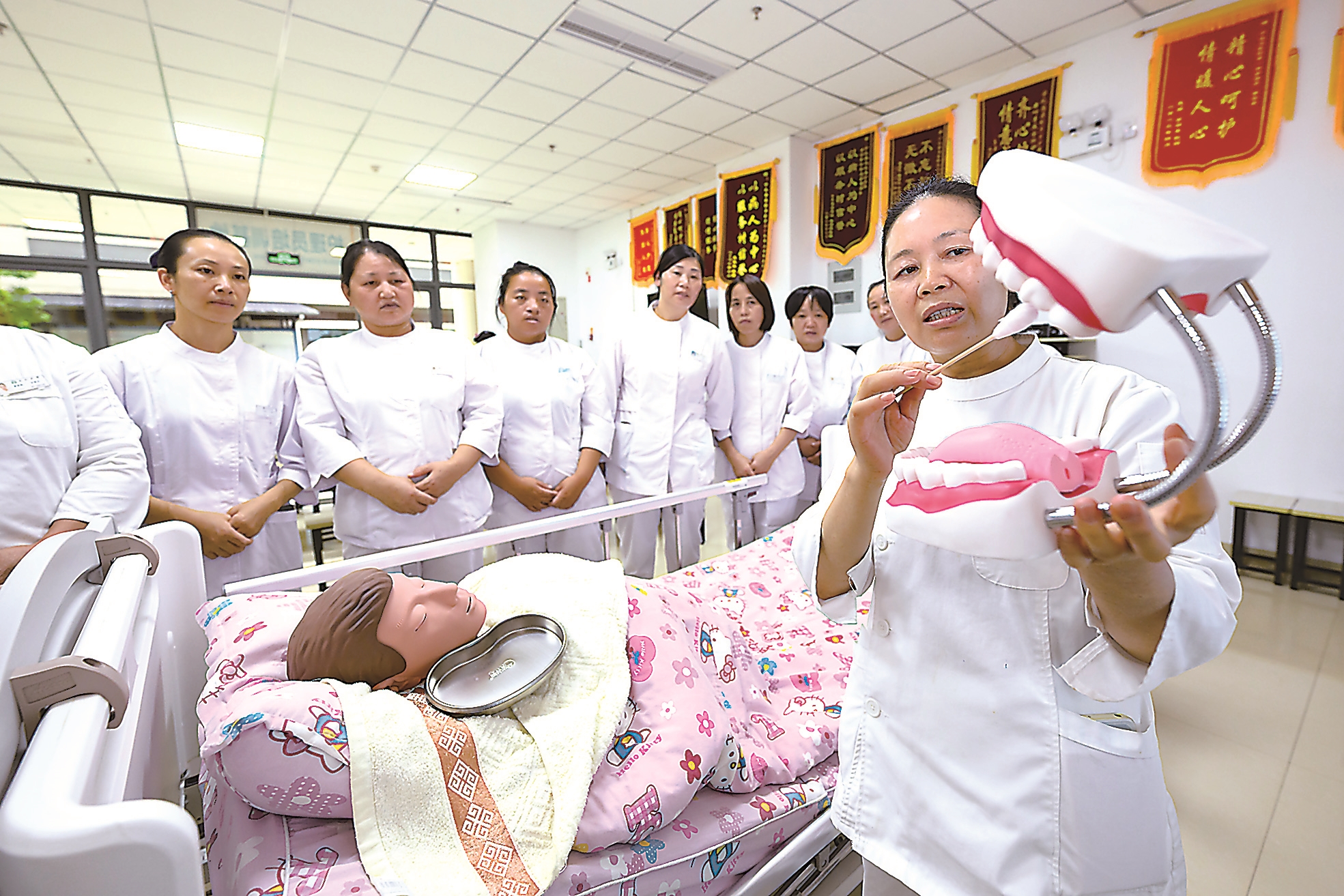“十四五”期间,我省在全国率先开展免陪照护服务试点工作。图为在宁化县总医院的护理员培训基地内,培训师在讲解口腔清理要点。资料图片