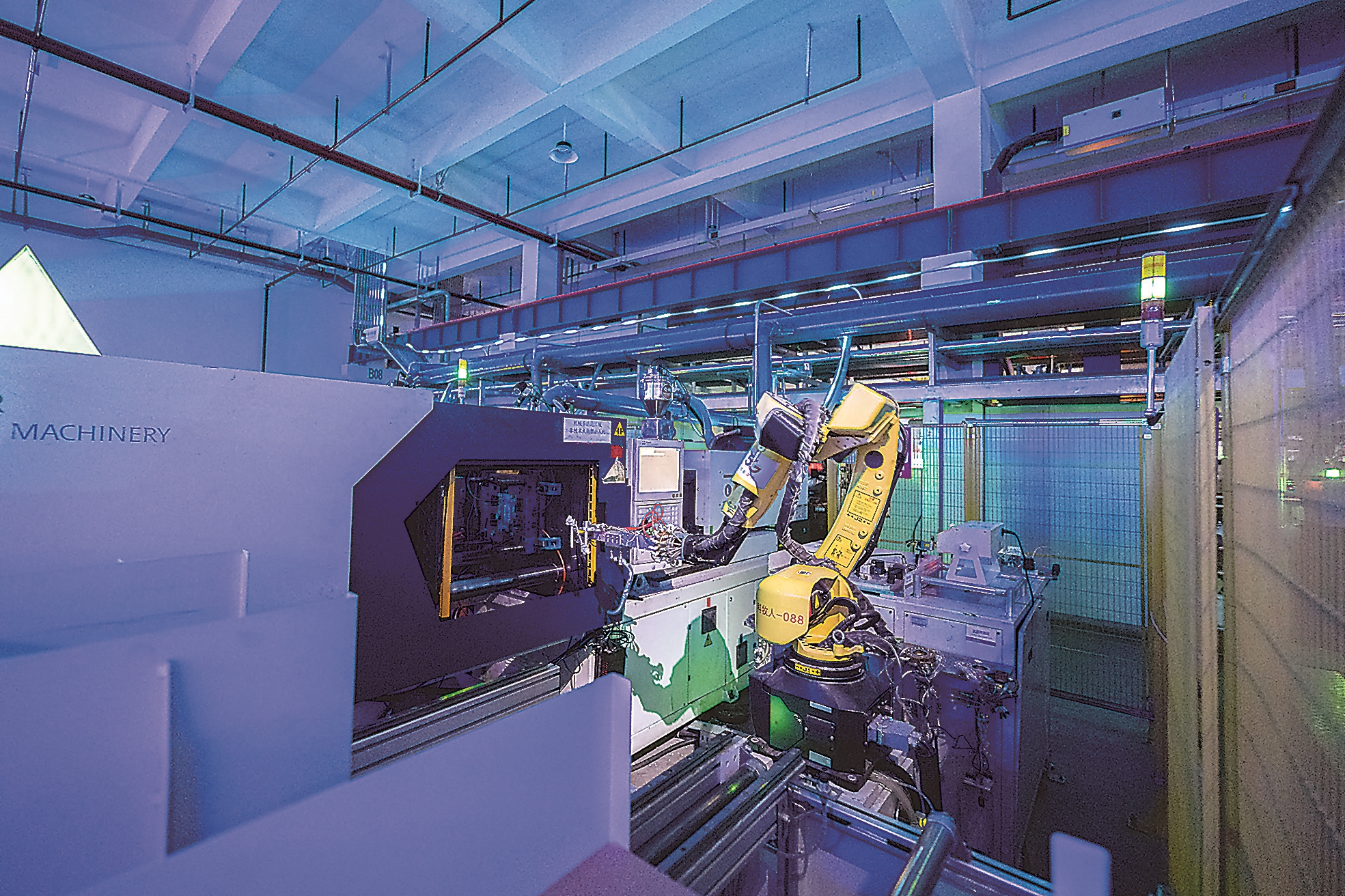 “十四五”期间,我省聚焦数字产业化、产业数字化“双轮驱动”。图为在泉州科牧智能公司的“绿色黑灯工厂”里,机器人在注塑生产线上工作。资料图片