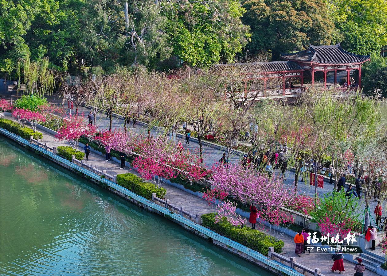 西湖公园柳堤两侧百余株桃树开花,与翠绿的柳枝相互映衬,绘就“桃红柳绿”的胜景。
