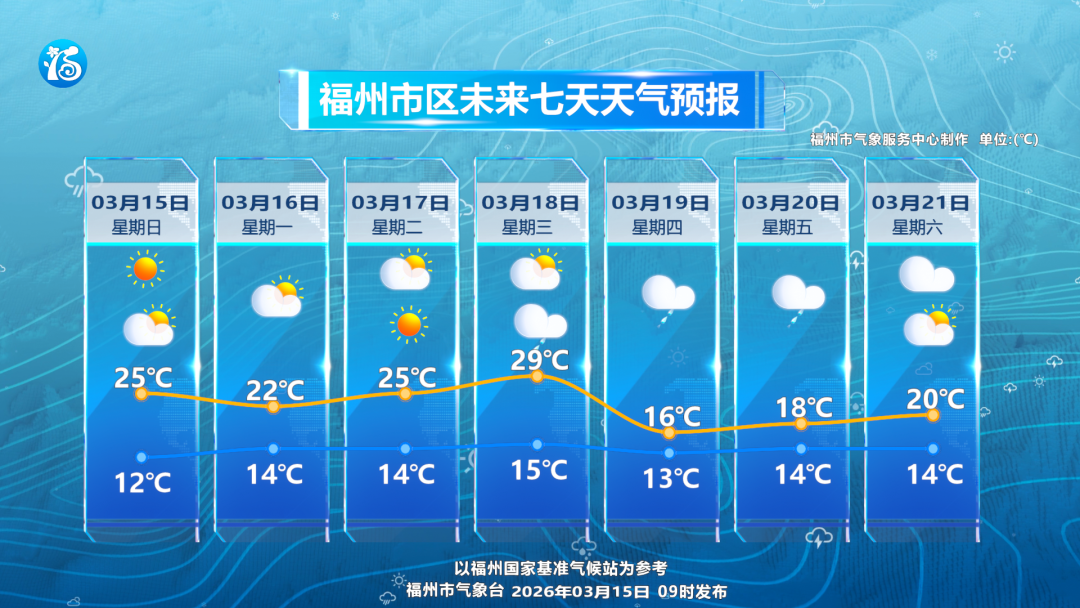 未来三天,福州天气以晴、多云为主,后期逐步转为多云转小雨。气温走势高涨,午后暖意持续攀升,到18日市区最高气温将升至29℃左右,春日氛围感拉满;但夜间气温回落明显,最低气温维持在12~15℃,昼夜温差普遍在10℃以上,部分时段可达13℃,“昼暖夜凉”的特点十分突出。