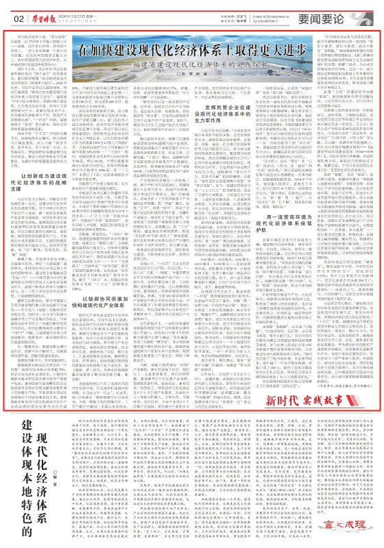 3月23日,学习时报第02版刊发了福建日报、学习时报联合推出文章《在加快建设现代化经济体系上取得更大进步——福建省建设现代化经济体系的实践探索》。文章聚焦福建让创新成为建设现代化经济体系的战略支撑、以链群协同思维加快构建现代化产业体系、发挥民营企业在建设现代化经济体系中的生力军作用、用一流营商环境为现代化经济体系保驾护航。一起来看详情——