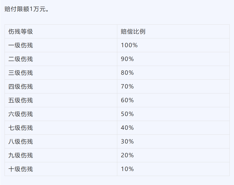 意外伤害住院医疗保障:赔付限额0.1万元(免赔100元后,按90%比例赔付)。