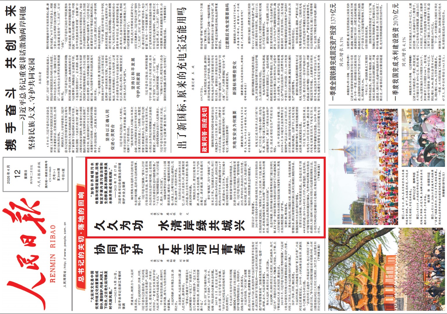 4月12日,人民日报头版头条刊发题为《久久为功 水清岸绿共城兴》通讯,点赞福建福州市聚焦民生诉求,系统推进城市黑臭水体治理,建立健全返黑返臭防范机制,实现昔日“脏臭乱”变身如今“清绿美”。