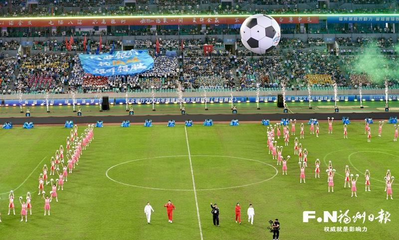 4月19日晚,福州海峡奥体中心体育场内,5万多名球迷身着蓝色或橙色的助威衫,挥舞着旗帜与荧光棒,将看台渲染成一片涌动的彩色海洋,2026年福建省城市足球联赛(“闽超”)在这里启幕。