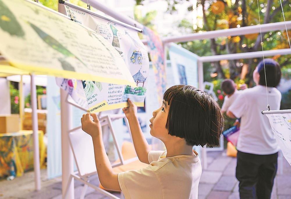 在春日市集的自然生态互动阅读区,一名小朋友观看儿童鸟类自然观察笔记。记者 施辰静 摄