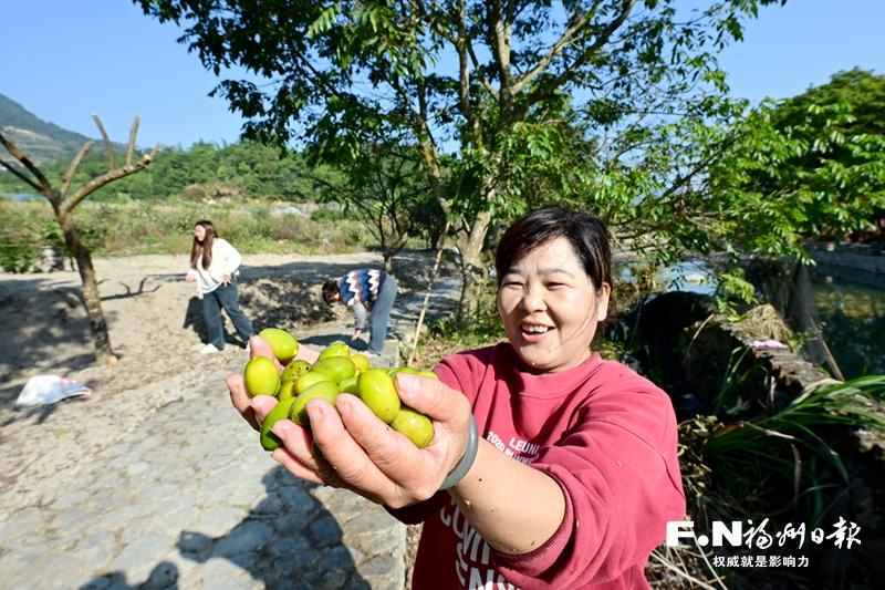 闽侯溪源村村民展示刚采摘的橄榄。