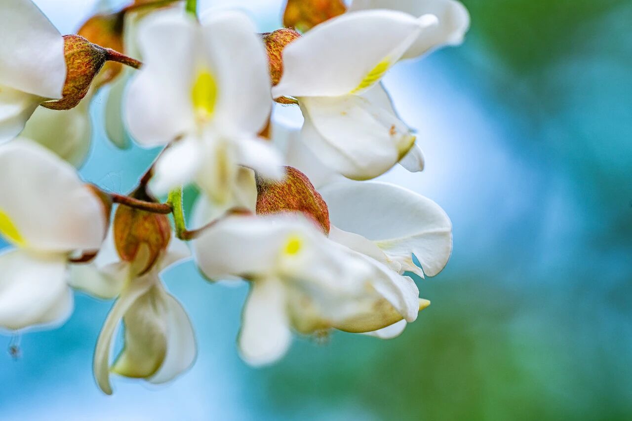 洋槐花的树枝上有刺,洋槐花干燥花呈白色且略带绿色,开花呈钟状,花冠白色,旗瓣近圆形,气味芳香,味道甘甜,沸水浸泡后,溶液为淡黄色;