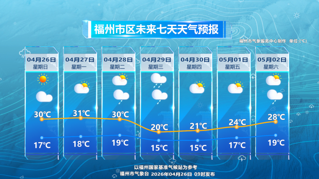 好天气不会一直持续,28日起天气转折,全市多云转阵雨或雷阵雨,局部地区可能出现中雨。29日雨势进一步增强,全市阴有中雨伴雷电,部分大雨,局部暴雨。要关注较强降水对数字峰会等户外活动和交通出行的影响。雨水打压下,29日气温下降明显,市区高温降至20℃,低温15℃,要及时添衣保暖。