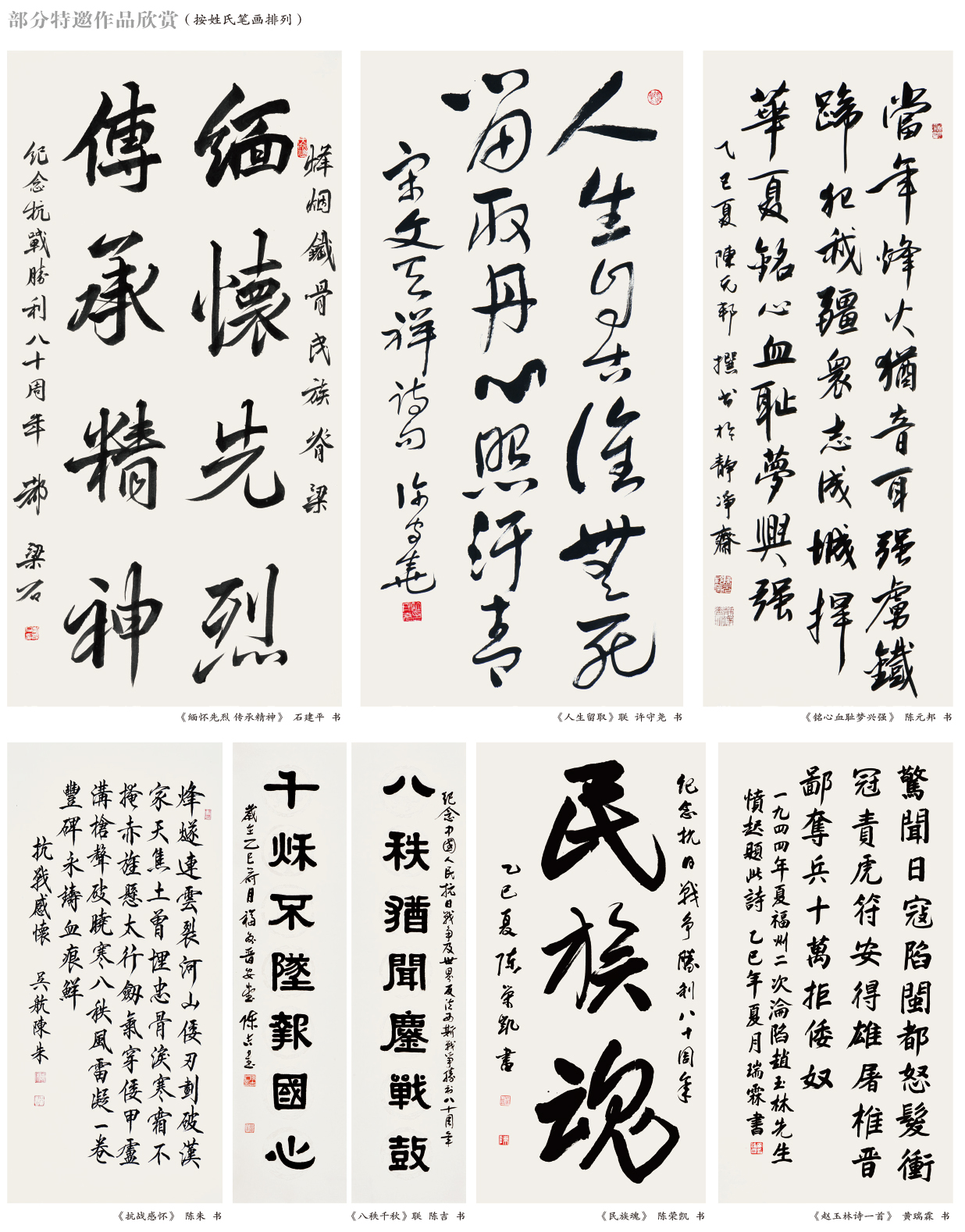 八十载岁月更迭,历史不容忘怀。此次展览汇聚福建省老中青三代书法名家与爱好者的力作八十幅,由“特邀创作”“公开征集”两种方式征集而来,既保证了艺术高度,也体现了群众参与。八十幅作品,凝聚八十种感悟,这些力透纸背的书写,生动再现了中国人民在抗战中的英勇身姿;铁画银钩之间,尽显民族气节;笔墨氤氲之中,回荡历史呐喊。