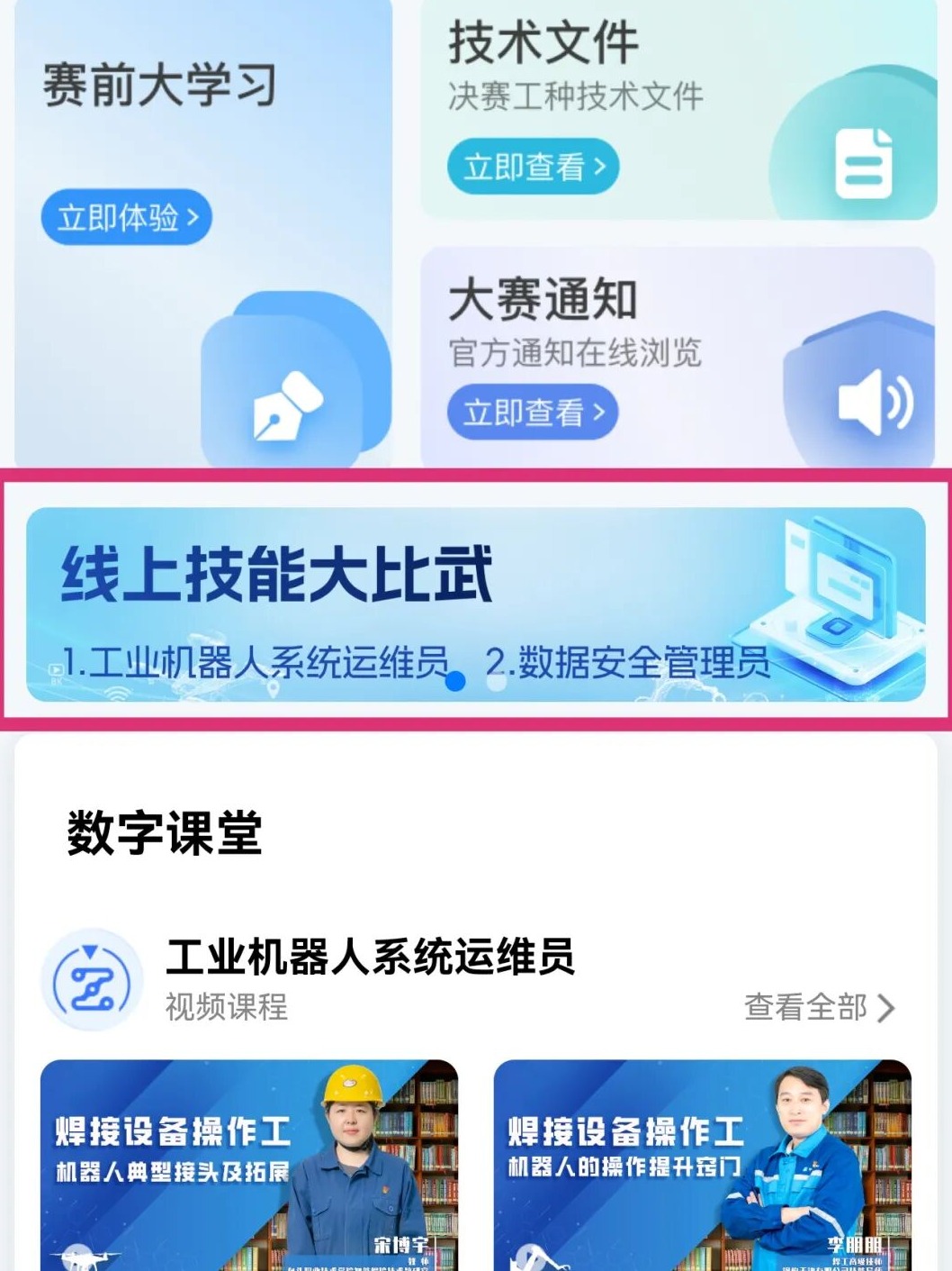 11月9日17:00前登录“职工之家”APP,先点击首页轮播图上的“第二届职工数字化应用技术技能大赛”专区,跳转页面后,再点击“线上技能大比武”,即可报名。