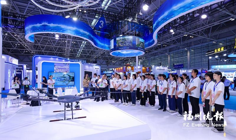 17日,一群学生在福州冶城集团展位参观,技术团队介绍“福智巡”平台的低空应用场景。福州冶城集团供图