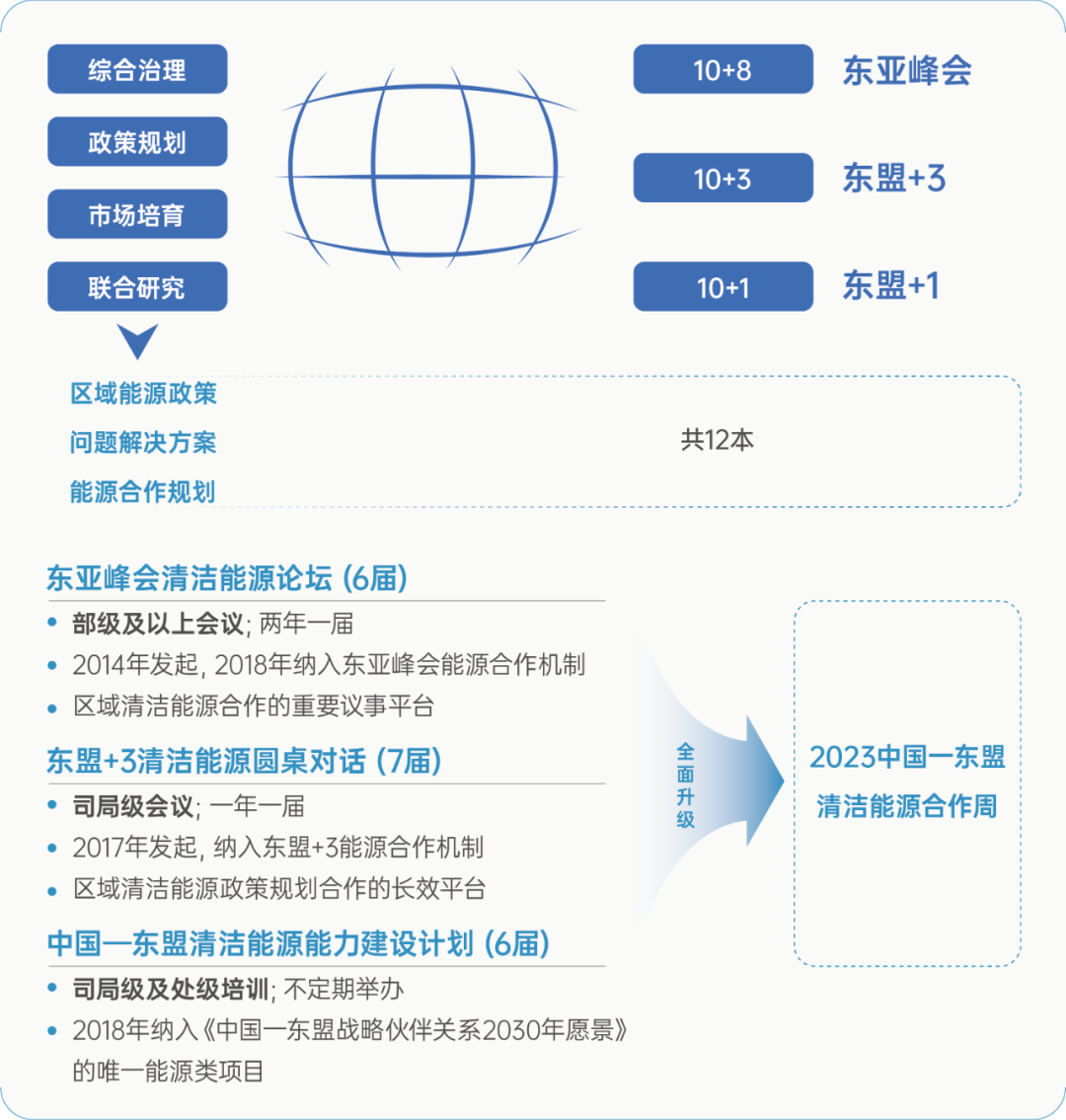 20余场活动:在“东亚峰会、东盟+3、中国—东盟”能源合作框架下,双方打造了三大品牌,共举办20余场活动,其中包括6届“东亚峰会清洁能源论坛”、7届“东盟+3清洁能源圆桌对话”、6期“中国—东盟清洁能源能力建设计划”。此外,还举办了1届“中国—东盟清洁能源合作周”。