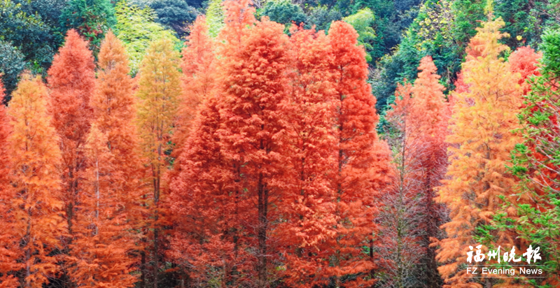 古洋村的水杉林披上“红妆”。