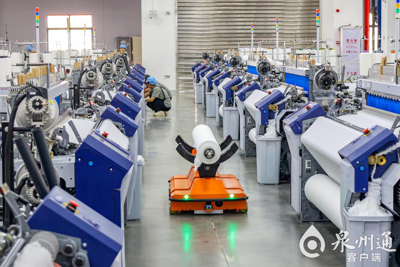 在石狮豪宝织造有限公司试生产的车间内,自动挂纱、自动落布、自动穿综、AGV小车穿梭取布,随处可见的智能化设备,让生产流程更加顺畅,偌大的一个车间仅需要几名工人看管即可。(李荣鑫 摄)